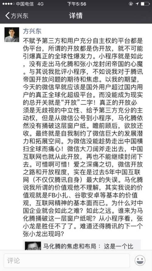 小程序在短短一周之内闹了个天翻地覆之后,也遭到了不少质疑,甚至很多上升到了对腾讯平台的抨击,媒体人方兴东在微信中转发一篇标题为《马化腾的焦虑和布局:这是一个比微信更重要的战场》中评论道:不赋予第三方和用户充分自主权的平台都是伪平台,所谓的开放都是伪开放,就不可能引爆真正的全球性爆发力。小程序就是如此,没有走出马化腾和张小龙封闭帝国的心魔。与其说我批评小程序,不如说我对于腾讯帝国开放问题的期待和焦虑。