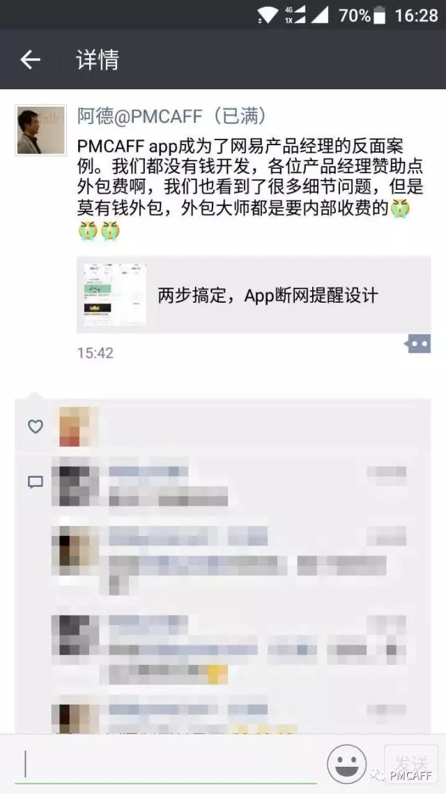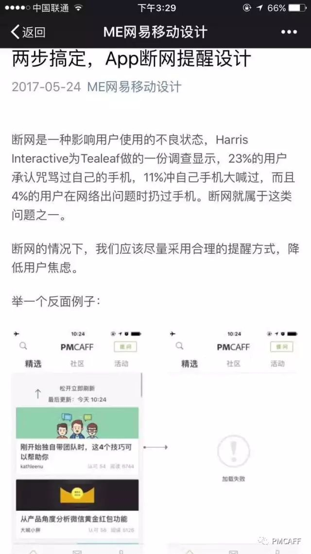 PMCAFF因断网提醒设计太烂被用户 @Cc丶 吐槽了,这篇吐槽还被网易转载了!