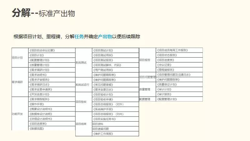 讲完了里程碑,我们来看一下里程碑的配套的产出物,PPT里面写了很多个产出物,这个就是比较完善和标准的产出物了,那么项目经理主要检查的就是这些点。