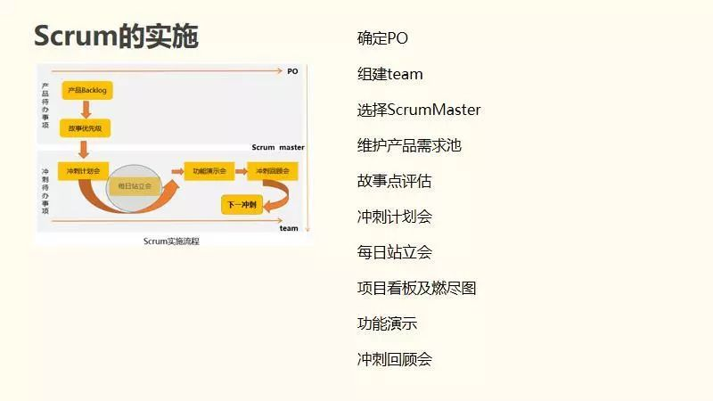 首先,你要确定你整个的团队(就是实施敏捷的试点团队),要确定你的PO(就是产品经理)的角色,然后要组建你的team,有几个工程师大概需要做什么,还要有一个Scrum Master的角色,它是可以兼职的。