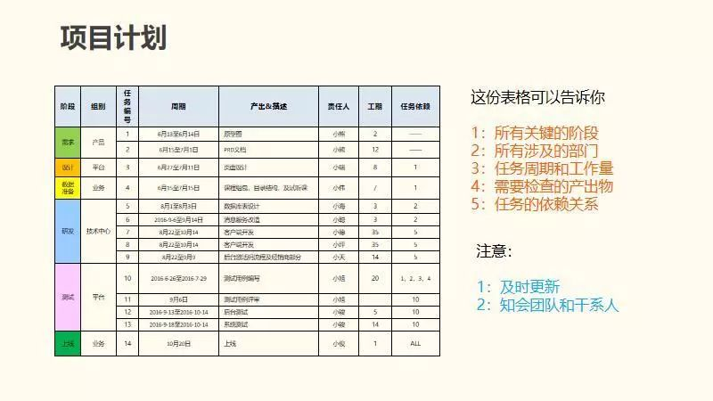 那整张表我们可以告诉你这些比较关键的信息:第一个是你这个项目所有关键的阶段,就是左边彩色,需求设计,研发,测试等等相关的阶段;第二个,是你所有涉及的部门。你要跟这些老大或者是他们具体的人员进行品牌的沟通,大家用到几个组,有些项目非常的复杂,跨业务线啊,跨BU,甚至跨外包公司,这种的外部合作其实都有。我把这个写出来有利于你简单明了的掌握所有的关系。然后他会告诉你:整体的任务的周期和整体的工作量是多少,用来评估你项目地优先级和难易程度,比如说我这个项目用到300人天,和一个用到15人天的项目。他在你的列表中的优先级肯定是不一样。