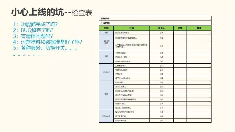 在上线过程中,其实有很多很多的坑。我推荐大家在上线的时候,做一个checklist检查表。这个确实每个公司每个产品线都不太一样,我给出了一份事例,是一个APP相关的。