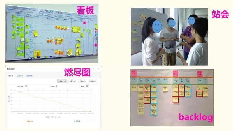 最左上角的是看版,这就是我们实际工作中,因为敏捷的团队所做的一个看板,上面贴了很多便利贴,就是一些工作的卡片,上面写了backlog,一些需求,还写了一些task,就是具体的工作任务,大家可以看到有红色或者是橘色不同颜色的卡片,他标识的不同的工作任务,有的是技术卡片,有的是bug卡片。也就是说,团队中的技术,相关的人员实际上都可以往上贴task,那么他整个的看板会摆在比较显眼的地方,大家每天都会站在前面开站会,可以看到右边有一张照片是team的成员站在看板前面开站会,他们在进行沟通,如果对当前的问题有疑问的话,他们就会直接移动黑板上面的卡片。