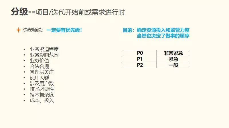 我给出的事例,当然每个公司都不一样,用P0,P1,P2,A,B,C都可以。那么这里的分类事例分类是这样的:P0就是非常的紧急,P1就是紧急,P2就是一般。那么高优先级的项目可以抢占或者是独占资源,低优先级的项目或者是任务,要向高优先级的让路。我们建议一个公司或者是一个产品线,对需求或者项目进行排序的时候,用统一的优先级排序方式。当然每个公司都不一样,如果大家不知道怎么定优先级的话,我给大家一些简单的参考的指标。