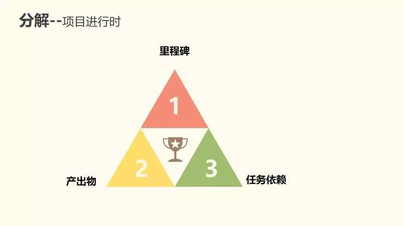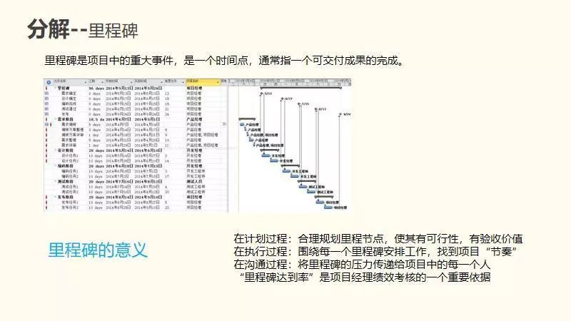 它实际上是项目中的重大事件,它是一个时间点。通常我们在里程碑会check一个可交付成果的完成,他其实具有非常大的意义。那么,你在项目做计划的时候能规划出了里程碑的节点。那么你就知道在每个节点需要验收什么。然后,围绕每一个里程碑安排工作。这样会比较有节奏感,同时如果你的项目周期稍长,设置里程碑之后,会把整个进度的压力分散开来。我们会发现在工作过程中,比如说是三个月项目周期。那么大家很多人会把工作挪到最后两三周才完成,导致拼命的加班和赶工。这会导致延限和质量的风险。而且里程碑的到达率其实也是项目经理考核的依据。