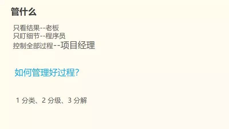 其实控制全部项目的过程是项目经理的角色,只看结果其实是老板。那么程序员,他大部分的只会盯着具体那块的细节。那么怎么管好整个的过程呢?我提供了以下的路线,第一分类;第二分集;第三对项目进行分解。
