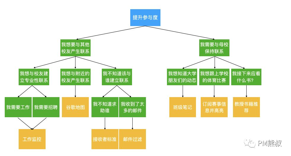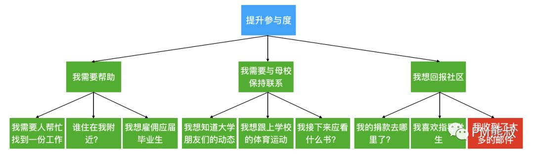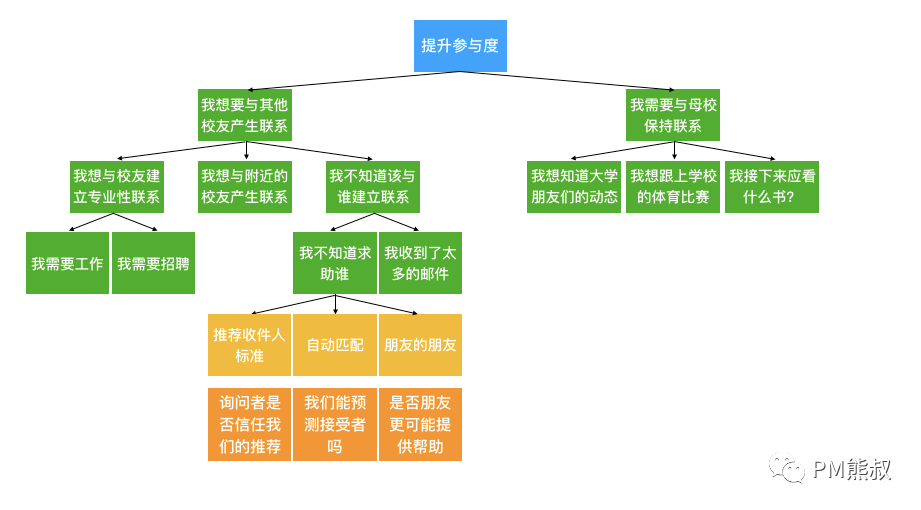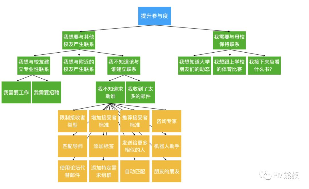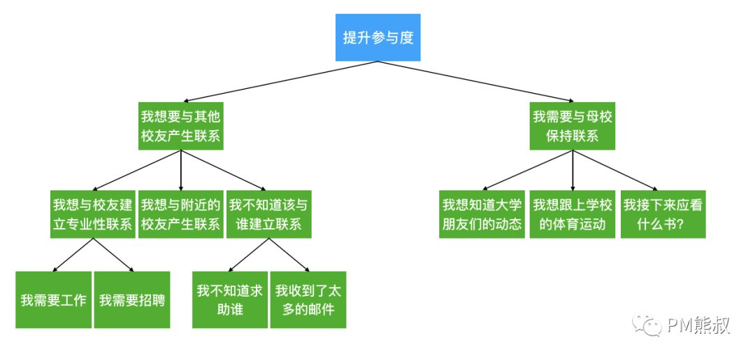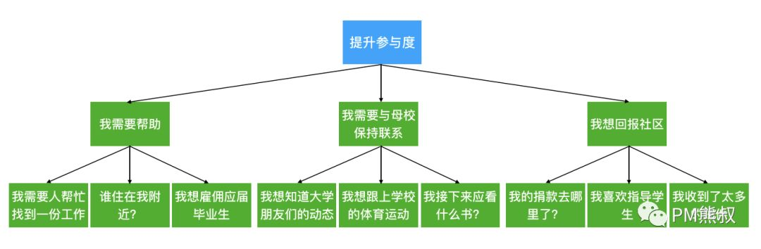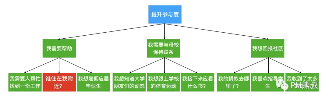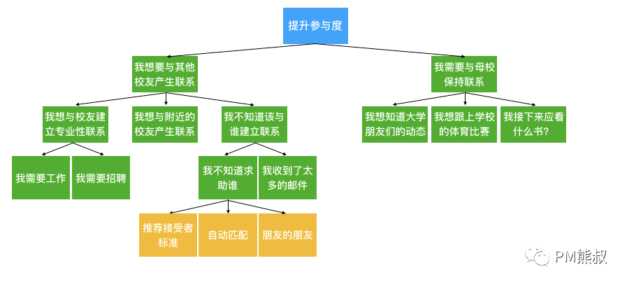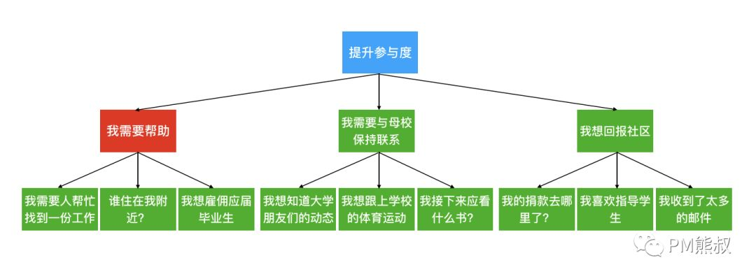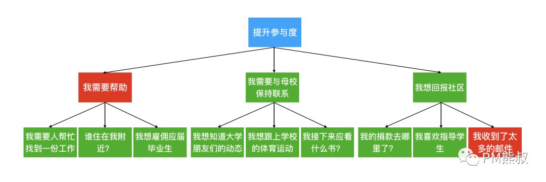 首先,我将“我需要帮助”和“我想回报社社区”的机会点合并为一个名为“我想与其他校友建立联系”的机会点,在它下面再有3个子节点:
