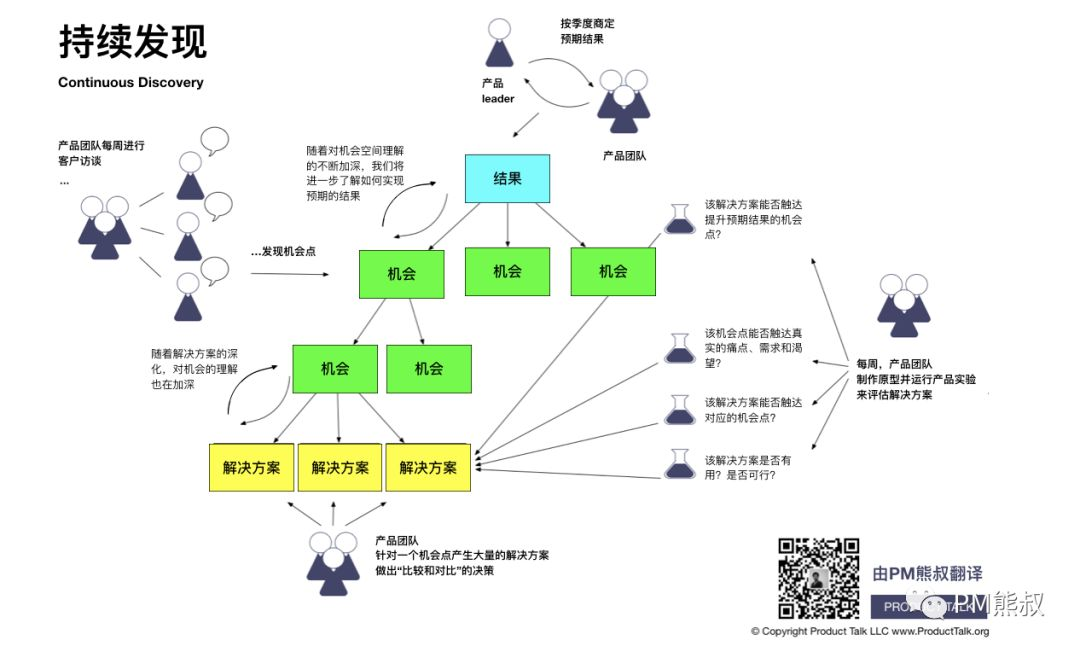 译者注:作者绘制了一张图描述了如何通过“机会解决方案树”做到持续发现的能力:产品团队按季度制定目标,通过每周进行客户访谈来发现机会点,然后针对一个机会点构思大量的解决方案,并制作原型和实验来评估解决方案的可行性,过程中不断的迭代优化。