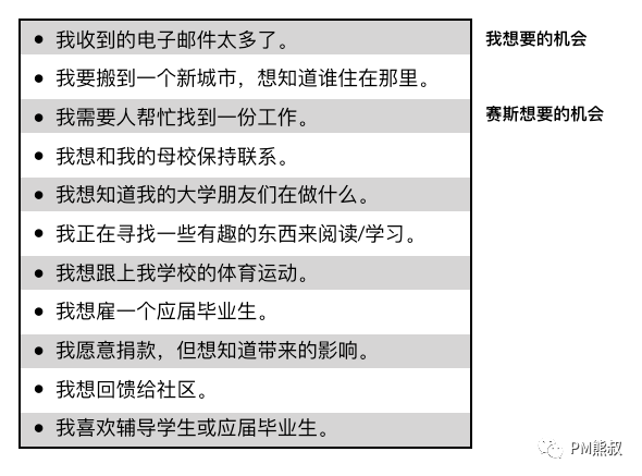 头脑风暴会议中,我认为减少垃圾邮件是一个正确的机会,而赛斯想的却是帮助人们与附近的校友建立联系。我们俩都只考虑了各自的一个机会点。