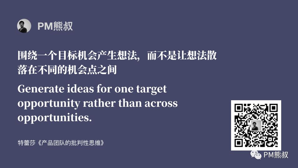 这样可以通过锁定一个目标机会来制定“比较和对比”的决策,而不是让想法散落在不同的机会之间。最终,你会发现有许多的想法去解决一个目标机会。