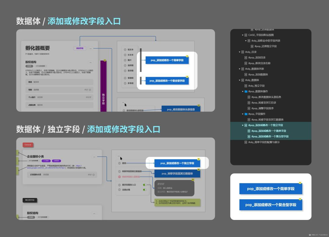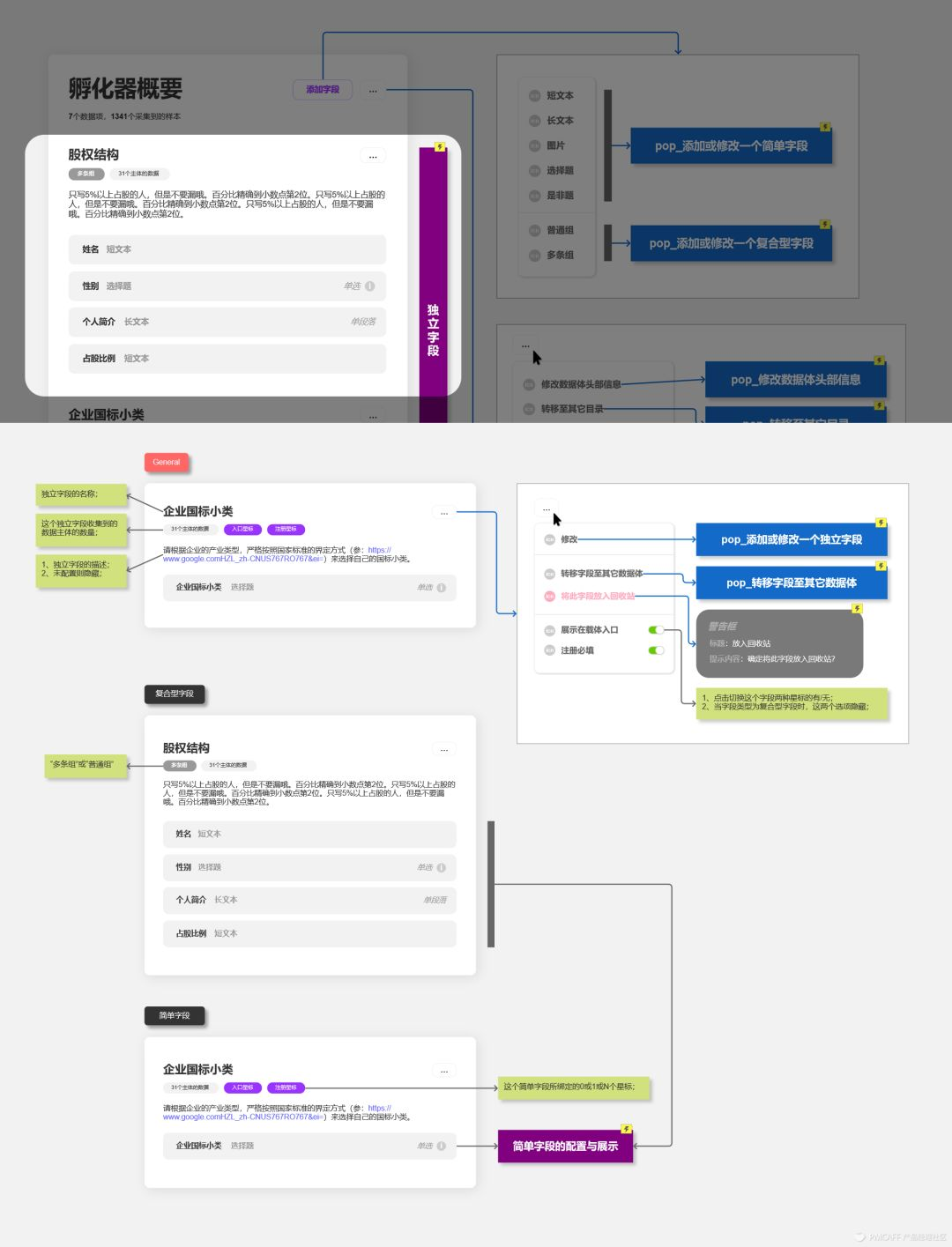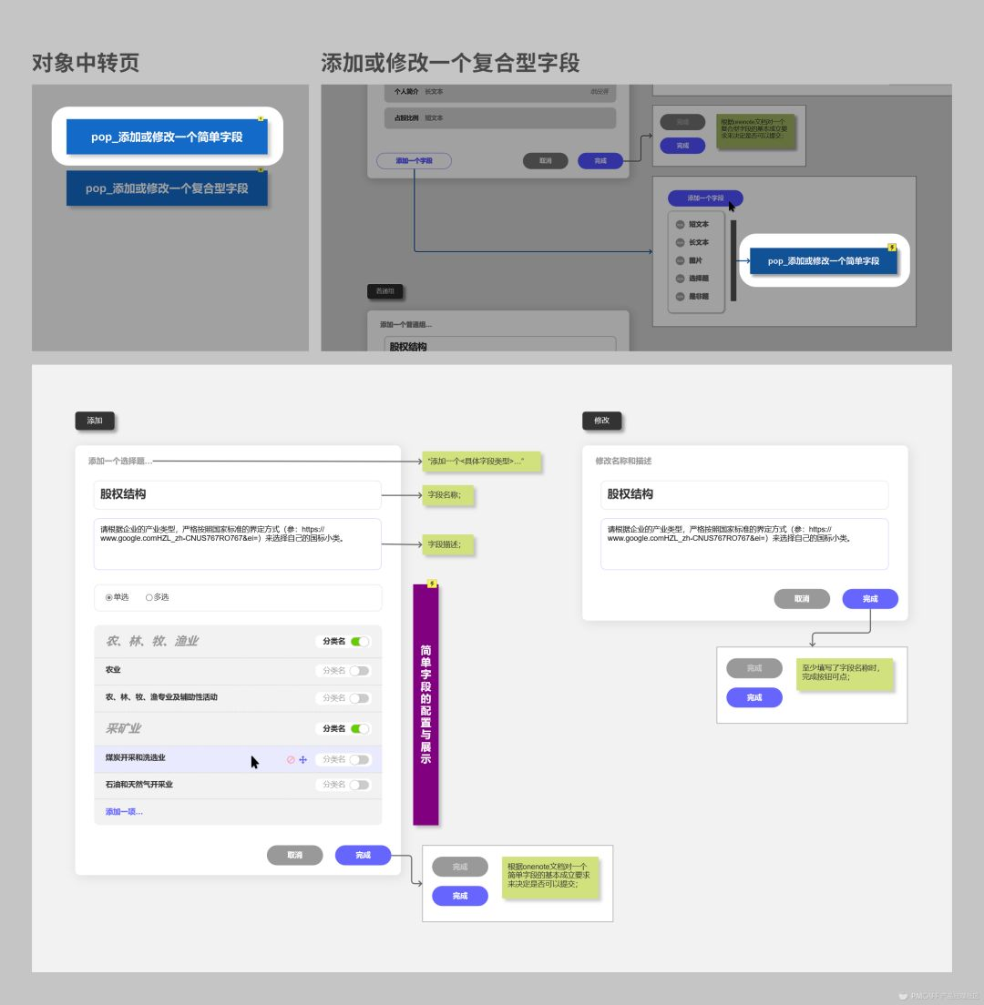 但是,问题在于,“添加修改简单字段”和“添加修改复合型字段”我是分成两个具体页面来画原型的。从数据体的菜单添加一个字段的时候,用户在菜单里直接就选择了一个字段类型,所以是直接前往具体的原型页面;而修改一个独立字段的时候,由于我已经抽象了两种字段的菜单,所以我是不知道你到底要去哪个具体原型页面的。