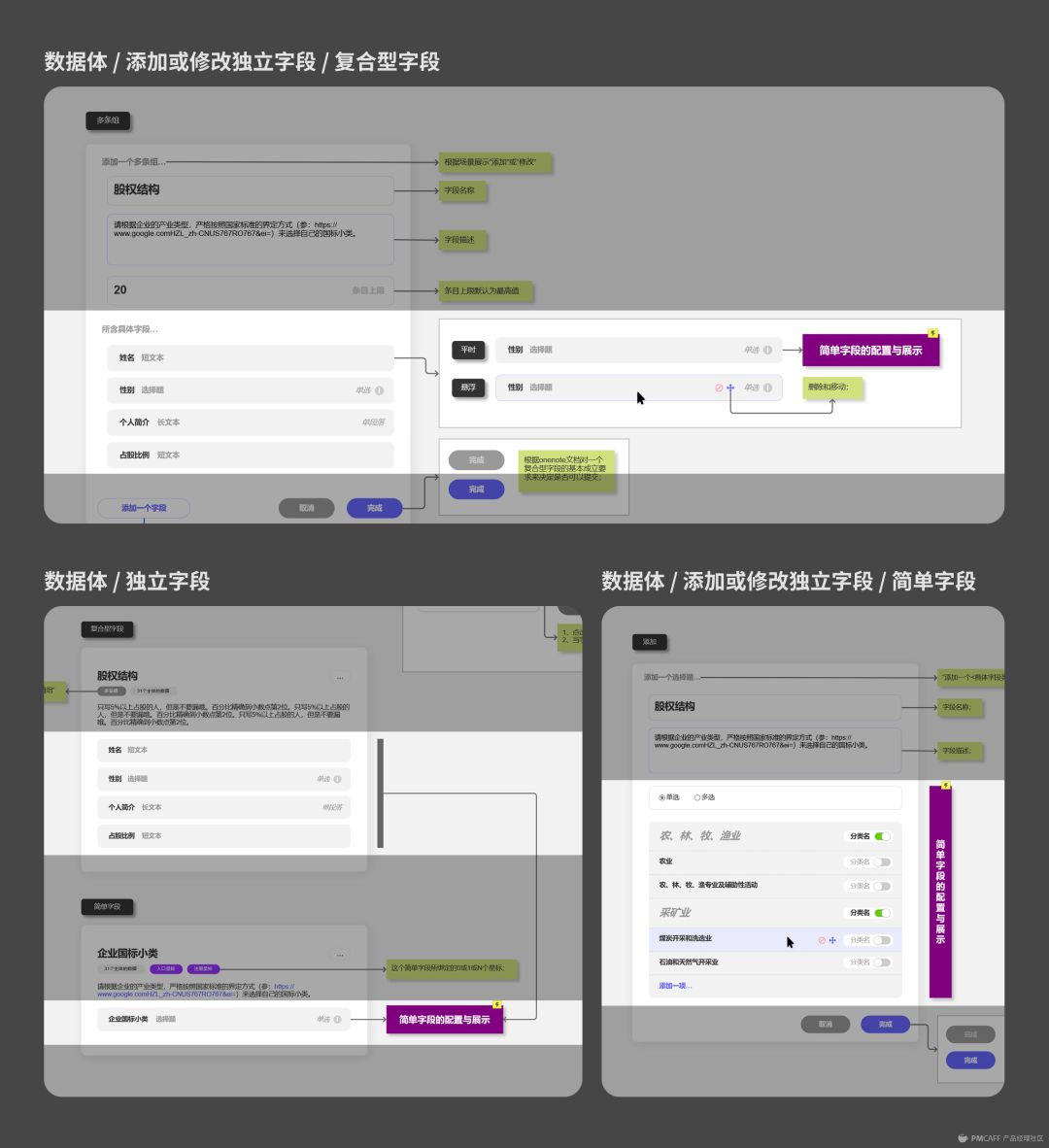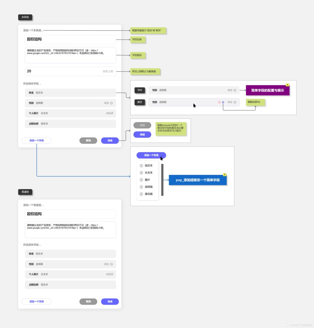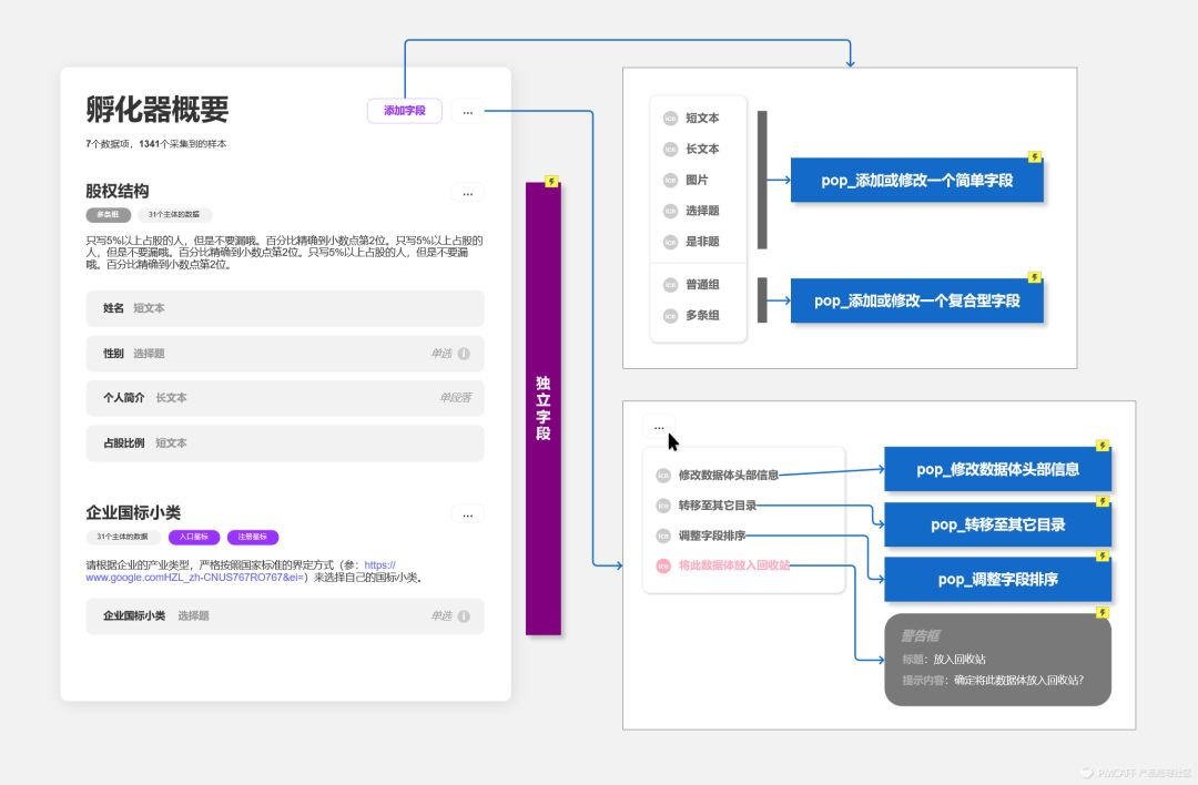 但是,问题在于,“添加修改简单字段”和“添加修改复合型字段”我是分成两个具体页面来画原型的。从数据体的菜单添加一个字段的时候,用户在菜单里直接就选择了一个字段类型,所以是直接前往具体的原型页面;而修改一个独立字段的时候,由于我已经抽象了两种字段的菜单,所以我是不知道你到底要去哪个具体原型页面的。