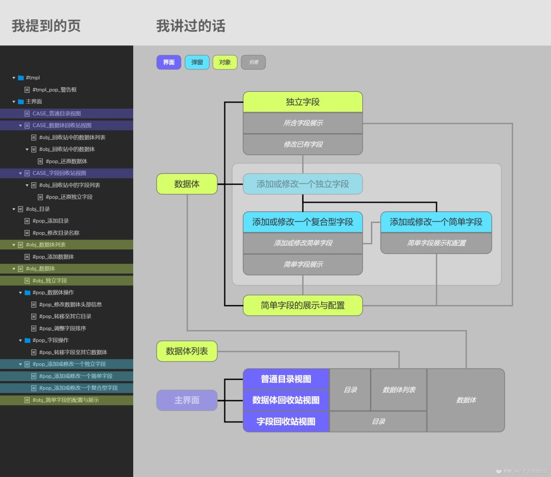 如上图所示,主界面的两个状态都出现了数据体列表,所以我把链接到数据体列表的小方块扔进了这两页中。程序员不管在其中那一页,只要他说“这个列表是怎么展示的?哦,下面有个小方块,我点进去看一下”,他都会进到下面这个文档里。