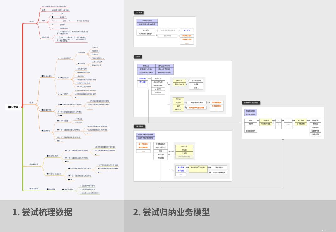 我在第二步(右图)尝试着把梳理出来的数据转化成业务模型,新手不要这样做,因为画这种模型的基础,是你已经可以很娴熟地撰写业务逻辑文档,从而能够直接凭空想象这些文档,在大脑里直接把它图形化。这种能力对我来说,是在我写过至少80万字的文档之后才产生的。