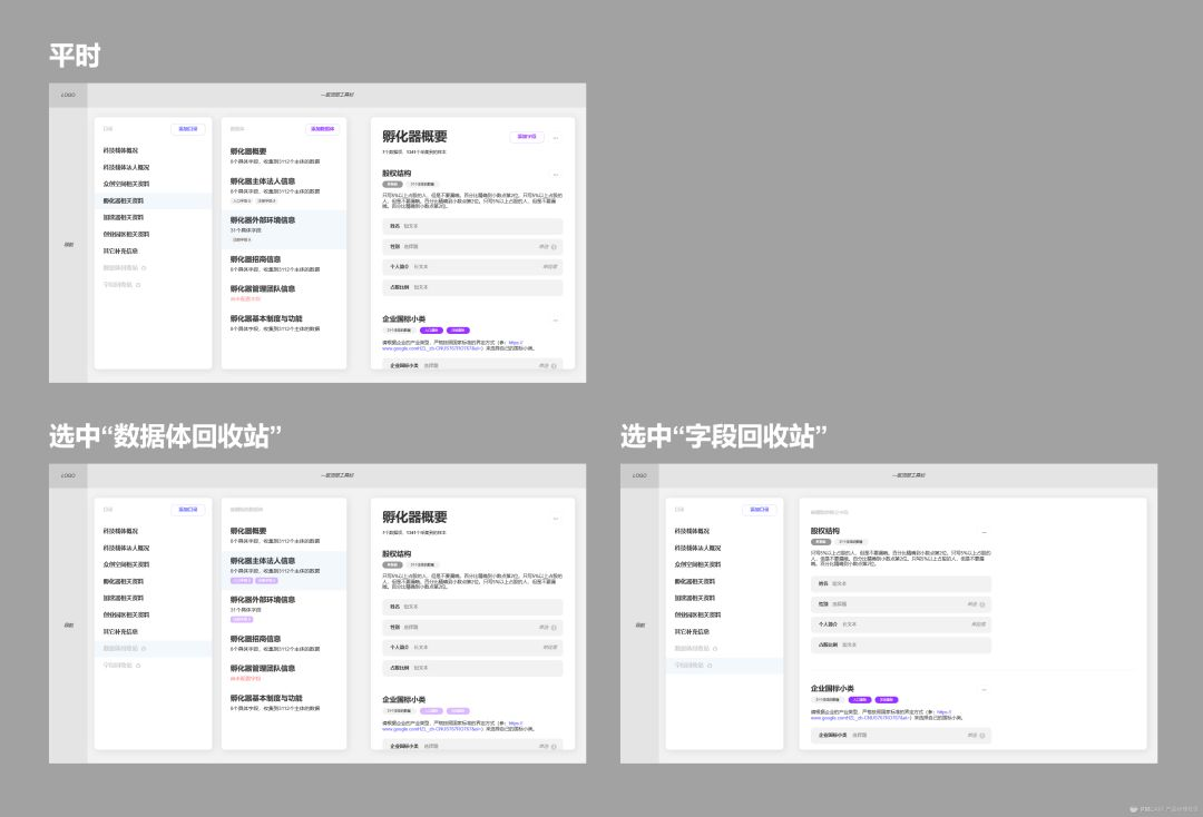 但是这一页是分三种状态的。除了平时的状态之外,还有两种特殊的状态。当用户在目录里选择的不是普通的目录,而是回收站的时候,由于回收站的功能会比较受限,所以页面的布局和元素也出现了阉割,从而影响了整个页面的布局。然而这三种状态又有很多共用的元素。如果在原型里把它们分开去讲述,显然就是把工作量扩大了至少三倍。