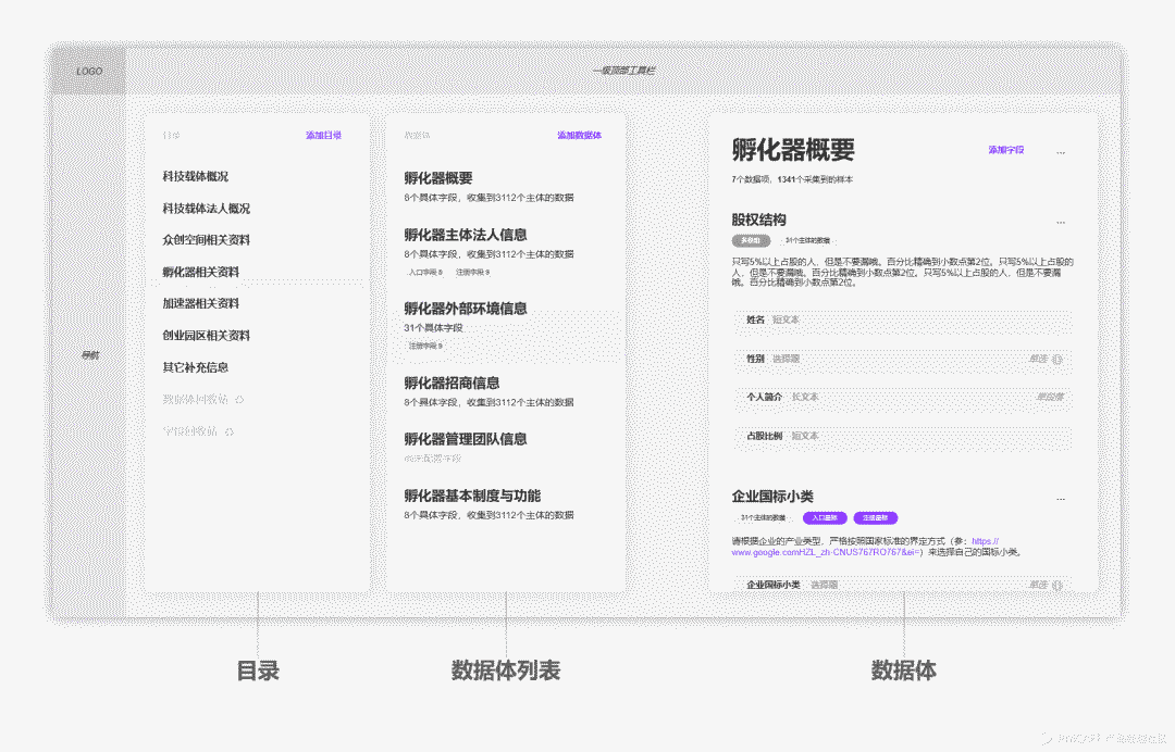 所以这个小表单我把它定义为“数据体”。一堆有关联的字段装进一个数据体里,然后这个数据体放在目录里,最后形成整个业务的表单。你可能会想,我直接让前端把最后一层目录自动展示成这样不行吗?这样不是更简洁吗?为什么还要多一个“数据体”的概念?这是因为——