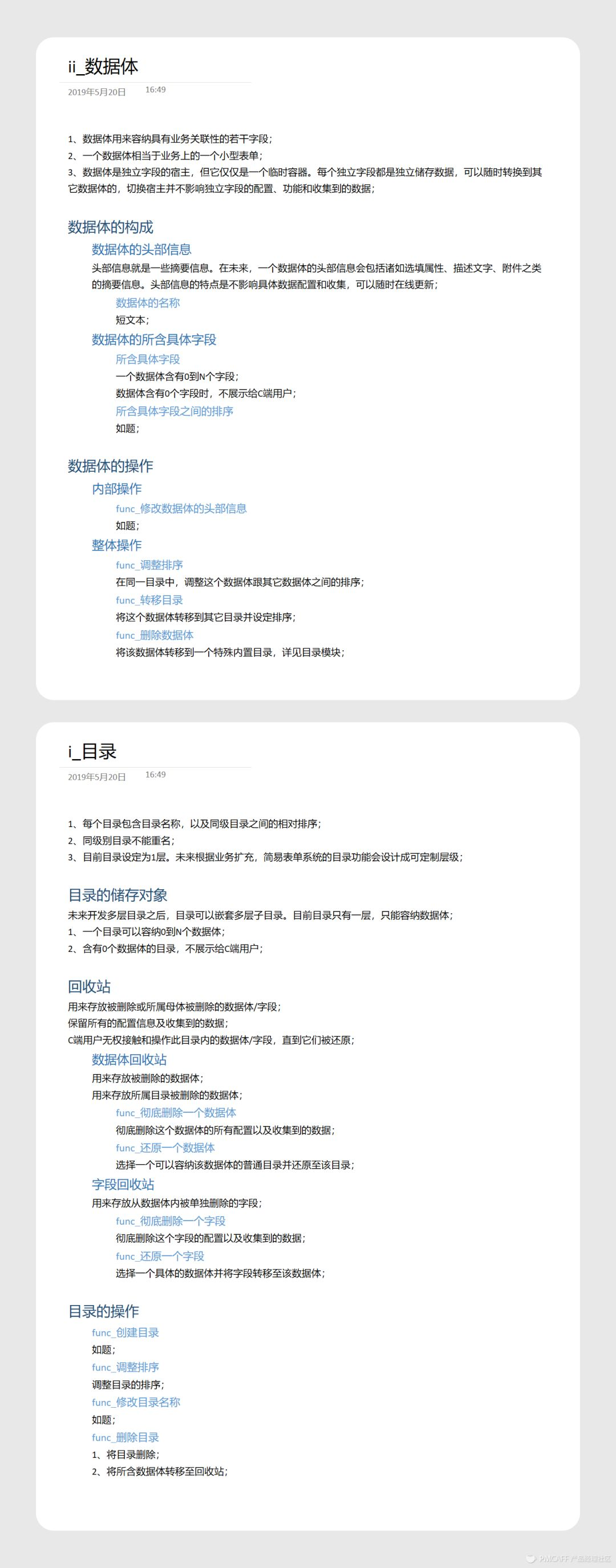 所以这个时候就可以写字段部分的后端逻辑文档了。不管这些字段在手机里的交互能玩出什么花样来,我们现在这一步只需要关注它在后端储存哪些属性,以及管理员可以对它进行什么操作(我在文档里用“func_”表示)。