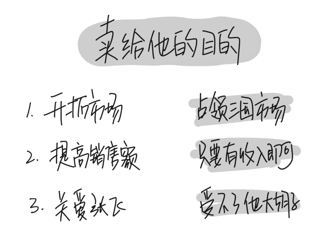 目的不同,战略方向也不同。如果只是提升销售额,卖一个算一个,那么卖给张飞的必要性就不大,我们应该去寻找更容易付费的人;如果是为了开拓市场,那更不应该从一个人切入,应该从一群人或一类人切入,避免出现一个产品只满足了某个人需求的情况。