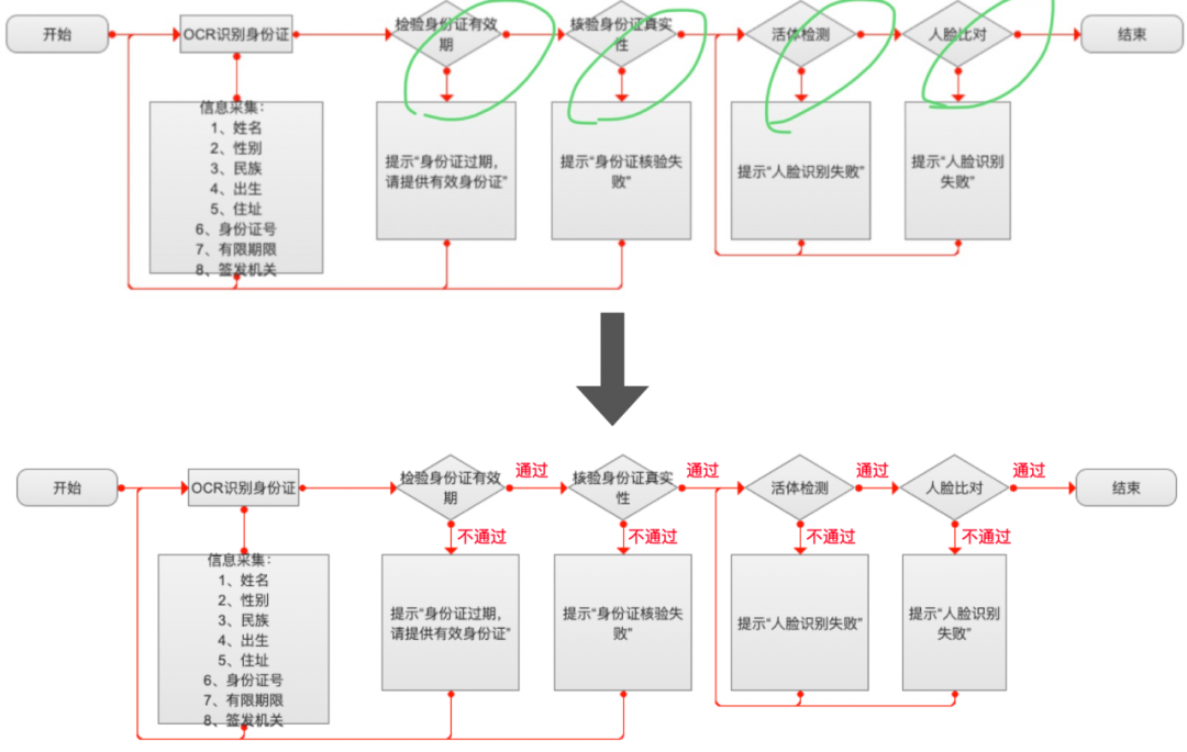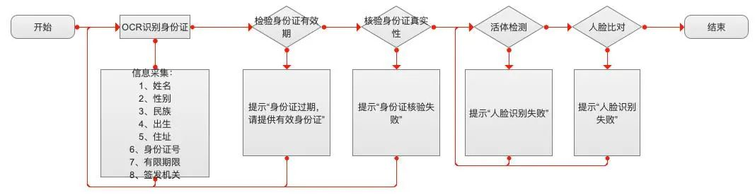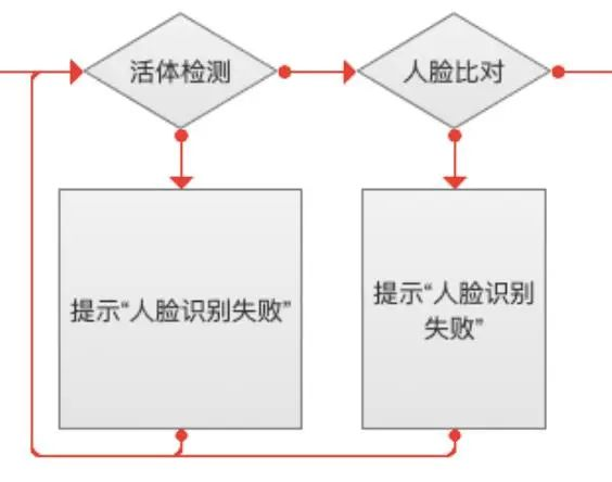上图中,活体检测不通过的后续处理节点应该是“重新进行活体检测”。人脸比对不通过的后续处理节点应该是“重新对比人脸”。
