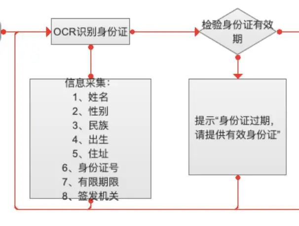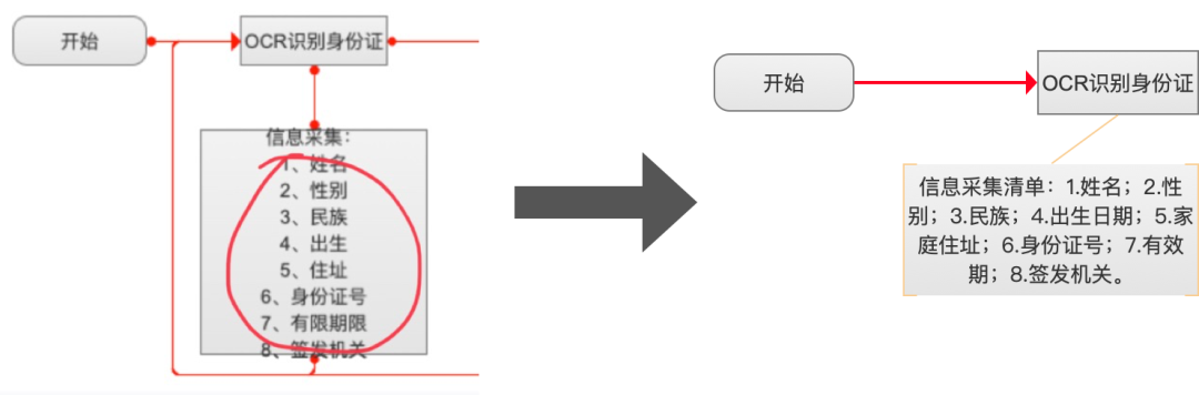 上图中,“OCR识别身份证”节点下方的信息采集内容清单,不是一个操作节点,仅仅是对“OCR识别身份证”节点的补充说明。应该改用“注释”来表达: