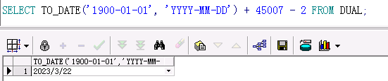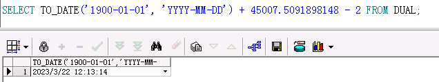 SELECT TO_DATE('1900-01-01', 'YYYY-MM-DD') + 45007.50918981 - 2 FROM DUAL;结果: