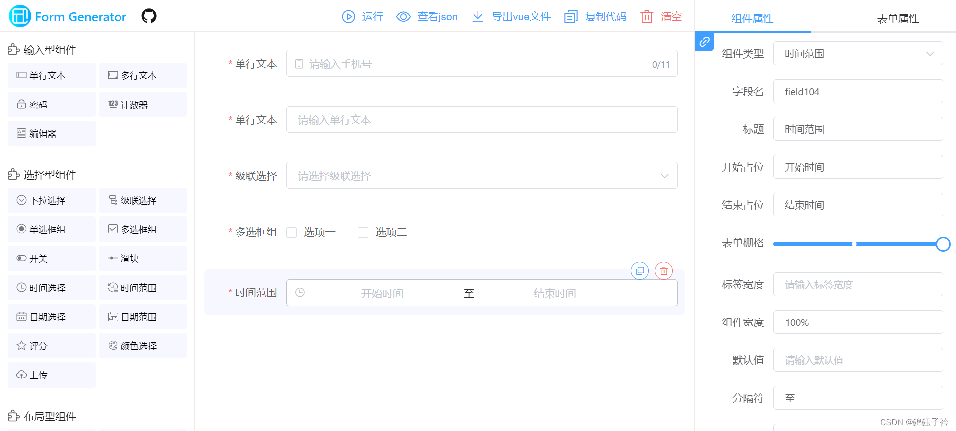 Element UI表单设计及代码生成器,可将生成的代码直接运行在基于Element的vue项目中;也可导出JSON表单,使用配套的解析器将JSON解析成真实的表单。