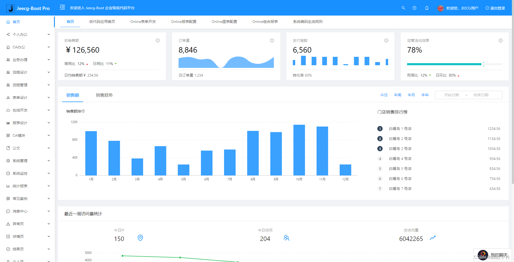 JeecgBoot是由北京国炬信息技术有限公司团队研发一款基于代码生成器的低代码平台!前后端分离架构 SpringBoot2.x,SpringCloud,Ant Design&Vue,Mybatis-plus,Shiro,JWT,支持微服务。强大的代码生成器让前后端代码一键生成,实现低代码开发! JeecgBoot 引领新的低代码开发模式(OnlineCoding-> 代码生成器-> 手工MERGE), 帮助解决Java项目70%的重复工作,让开发更多关注业务。既能快速提高效率,节省研发成本,同时又不失灵活性!