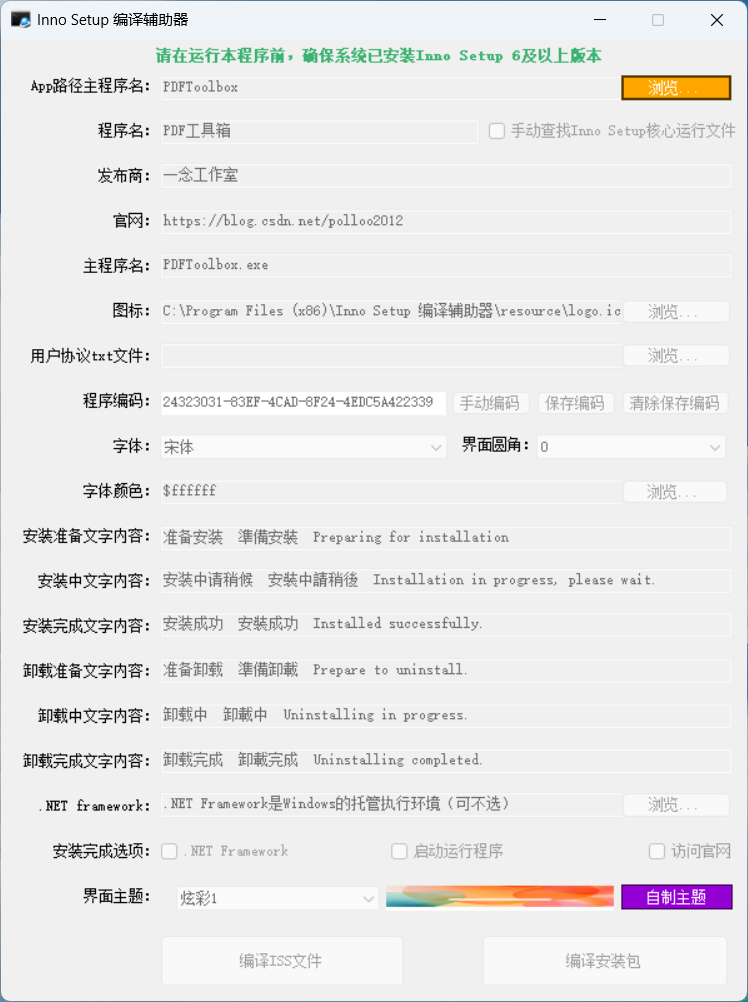 简述:填写下面文字框内对应的内容,ISS文件模板已编译好,不用安装Inno Setup软件(内部兼Inno Setup 6.3.3最新版插件---7.64M),即可编译安装包。