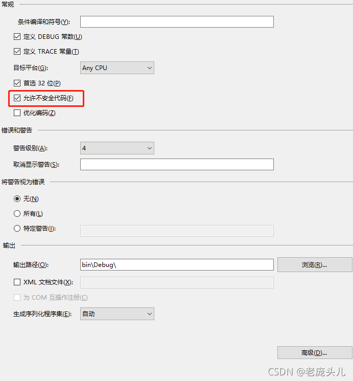 FFmpeg.AutoGen的很多函数都是用到了指针,工程里要勾选允许不安全代码