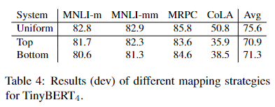 实验时,作者使用g(m)=3×mg(m)=3 \times mg(m)=3×m进行映射,也就是说4层的tinybert的每层都是从3层的bertbase中学得。