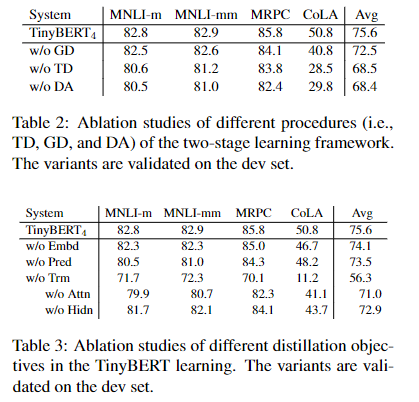 下面是作者对tinybert使用得学习策略和蒸馏方式做的消融实验: