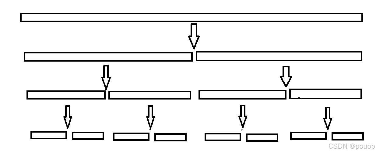 可以看到上图,长方形代表需要排序的数组,把他分成两半一半排完序之后和另一半排完序的数组组合在一起,然后被分的数组也变成两份之后排序,以此类推,这就是递归的用法。