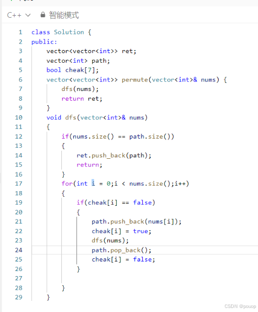 其中fds函数体中path.pop_back()就是环境清理,这是在利用全局变量时需要注意的点,当然如果把path放到函数递归函数中就不用进行函数清理,看哪种更适合就可以用哪一种。