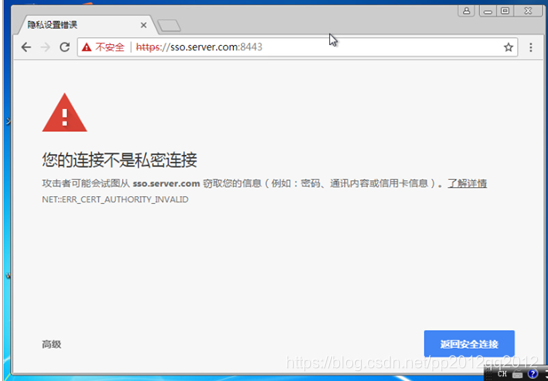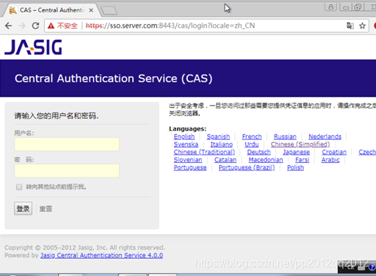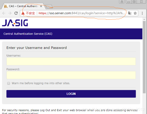 验证https是否配置成功:本案例本地使用google览器访问(似乎IE不好使),在地址栏输入https://sso.server.com:8443/出现下面画面,其实这就表明cas服务端tomcat的https协议配置没问题了。