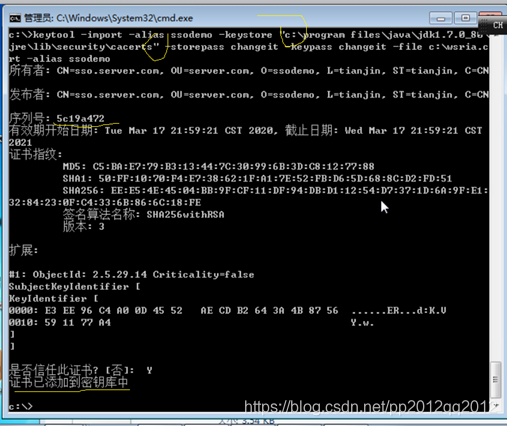 如果是多台机器演示,需要在每一台客户端导入该证书,步骤都是一样的。当看到提示“是否信任此证书”,输入y回车即可,见下图:(说明,命令中的-alias后面的别名可以自定义,如果出现”证书未导入,别名<***>已经存在”的错误,该意思是说客户端的密钥库中已经存在该别名证书了,重新指定其他别名即可)。