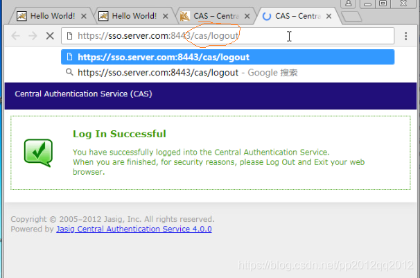 下面,我们新打开一个选项卡(也可在当前页面的地址栏输入),在浏览器地址栏中输入(图30):https://sso.server.com:8443/cas/logout