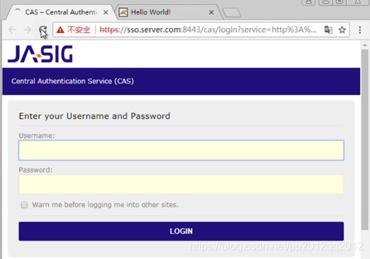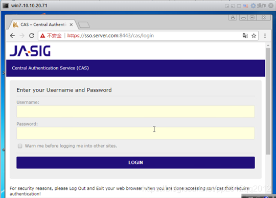 配置完成后,启动CAS服务端tomcat,再启动该客户端1的tomcat(tomcat-client1),在浏览器访问:http://sso.client1.com:18080/examples/servlets/servlet/HelloWorldExample看看是否跳转到了CAS认证界面,回车之后,见图19