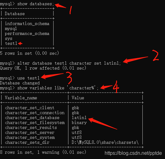 - alter database [数据库名称] character set [编码格式]