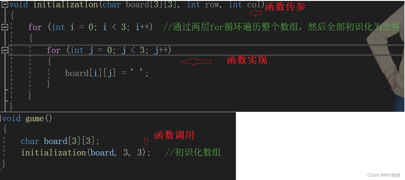 for (int i = 0; i < 3; i++) //通过两层for循环遍历整个数组,然后全部初识化为空格