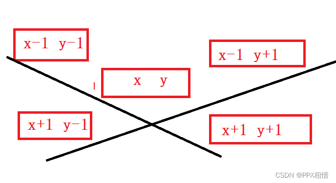 对角线是否相等: board[0][0] 和 board[1][1] 和 board[2][2]这是正对角,board[0][2] 和 board[1][1]