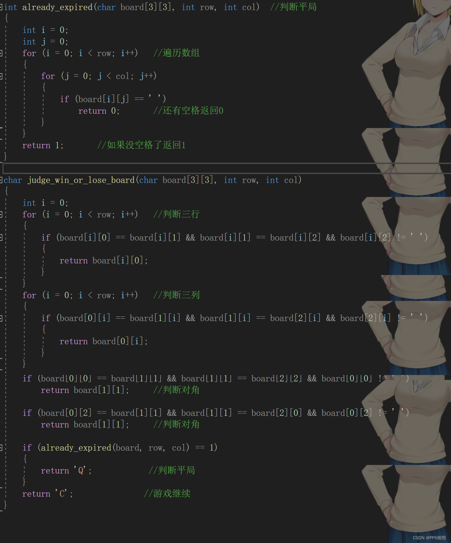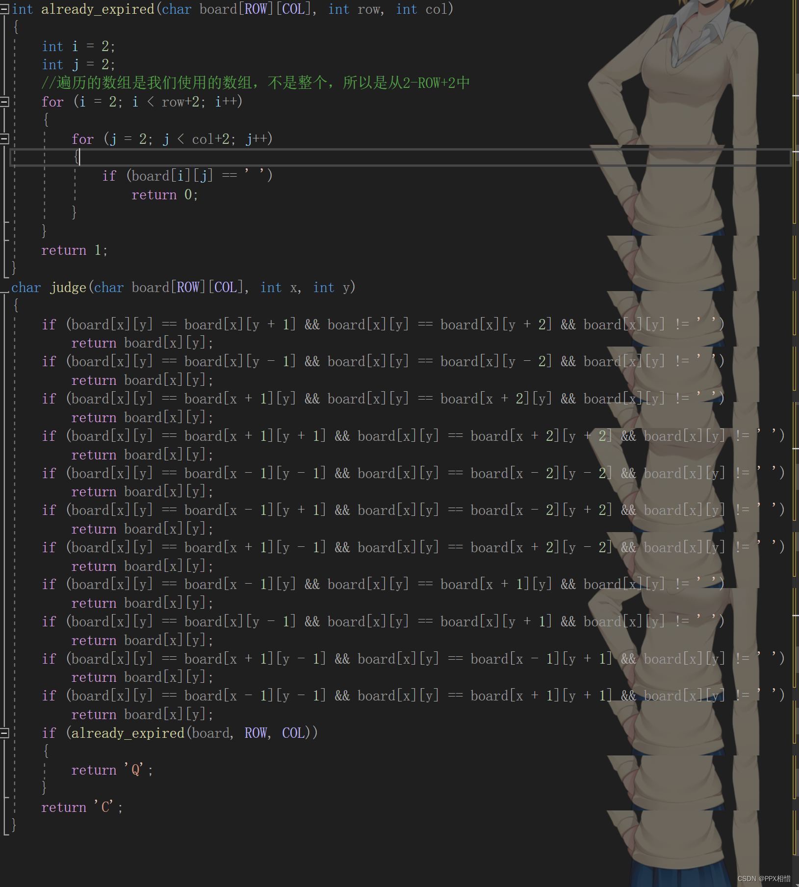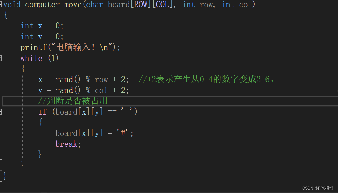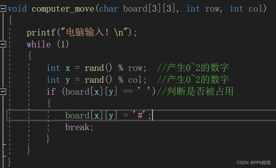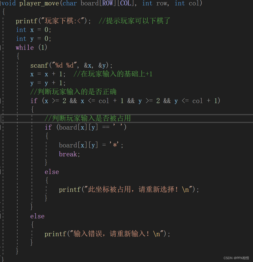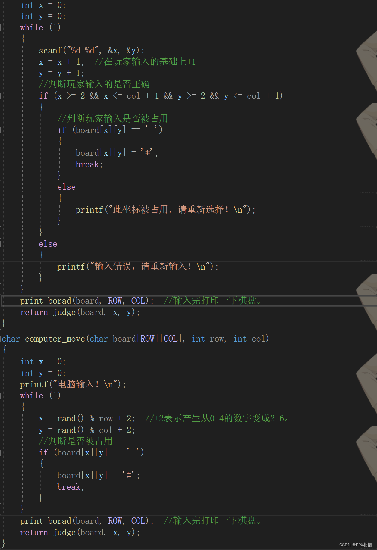 然后用if语句把他们都写进去就行,那么问题来了,怎么知道玩家和电脑下的坐标呢,出来电脑和玩家的输入函数就消失了,那么我们直接写一个函数,然后再输入函数内调用他,那么我们的输入函数不能再使用void类型了,要改为char型。
