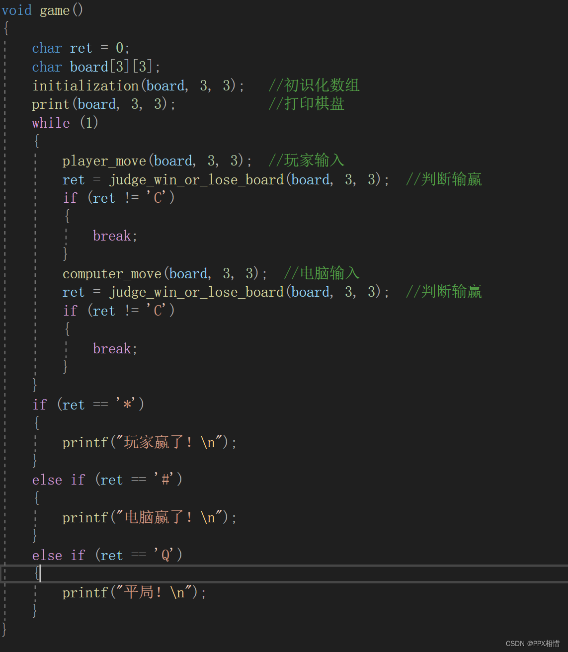 我们在玩家下完后和电脑下完后都判断一下,输出的是C就继续游戏,不是C就跳出循环,打印结果。