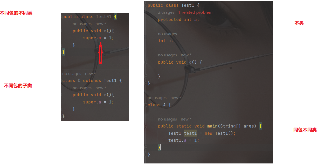 注意:protected在不同包中的子类中要使用就得用super,但是super无法在static中使用,所以无法