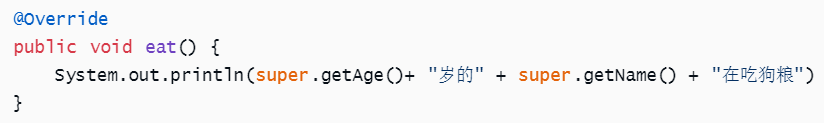 System.out.println(super.getAge()+ "岁的" + super.getName() + "在吃狗粮");