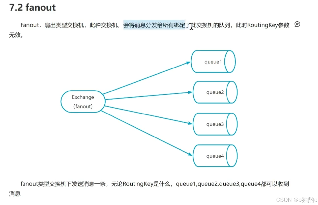 public class ProducerFanout { public static void main(String[] args) throws Exception { //交换机名称 String exchangeName = "dz_exchange_test_fanout"; //队列名称 String queueName_1 = "dz_queue_test_Fanout_1"; String queueName_2 = "dz_queue_test_Fanout_2"; String queueName_3 = "dz_queue_test_Fanout_3"; String queueName_4 = "dz_queue_test_Fanout_4"; // Fanout 交换机,不论路由键是多少,都会将消息发送给所有绑定的队列 // 这里演示设置不同的路由键 String key_1 = "key_1"; String key_3 = "key_3"; String key_4 = "key_4"; //创建连接工厂 ConnectionFactory factory = new ConnectionFactory(); //设置参数 factory.setHost("123.57.144.143"); factory.setPort(5672); //账号密码 factory.setUsername("admin"); factory.setPassword("admin"); //创建连接对象 Connection connection = factory.newConnection(); //创建信道 Channel channel = connection.createChannel(); /* * 创建交换机 * 1、交换机的名称 * 2、交换机类型,fanout、topic、direct、headers * 3、指定交换机是否需要持久化,true:需要持久化,false:不需要持久化 * 4、指定交换机在没有队列绑定时是否需要删除,true:删除,false:不删除 * 5、Map<String,Object> 类型,用来指定我们交换机的其他一些机构化参数,我们在这里直接设置为null */ channel.exchangeDeclare(exchangeName, BuiltinExchangeType.FANOUT,true,false,null); /* * 生成一个队列 * 1、队列名称 * 2、队列是否需要持久化,但是要注意,这里的持久化只是对类名称等这元数据的持久化,不是队列中的消息的持久化 * 3、表示队列是不是私有的,如果是私有的,只有创建它的应用才能消费消息 * 4、队列在没有消费之订阅的情况下是否自动删除 * 5、队列的一些机构化参数信息,比如,声明私信队列,磁盘队列会用到 */ channel.queueDeclare(queueName_1,true,false,false,null); channel.queueDeclare(queueName_2,true,false,false,null); channel.queueDeclare(queueName_3,true,false,false,null); channel.queueDeclare(queueName_4,true,false,false,null); /* * 将交换机和队列进行绑定 * 1、队列名称 * 2、交换机名称 * 3、路由键,在直连模式下,路由键和队列名称是一致的 */ channel.queueBind(queueName_1,exchangeName,key_1); channel.queueBind(queueName_2,exchangeName,key_1); channel.queueBind(queueName_3,exchangeName,key_3); channel.queueBind(queueName_4,exchangeName,key_4); /* * 发送消息 * 1、发送到那个交换机 * 2、路由键名称 * 3、其他的参数信息 * 4、发送消息的消息体 */ // 这里只给一个队列发送消息,但是会被所有绑定的对类收到 channel.basicPublish(exchangeName,key_1,null,"Fanout_key_1".getBytes()); //关闭连接 channel.close(); connection.close(); } }
