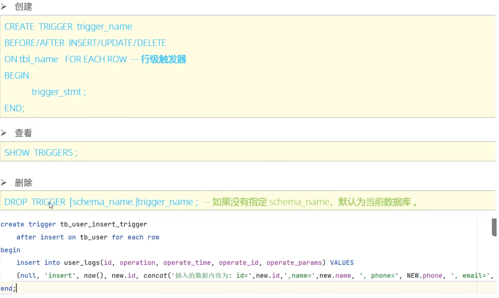主要作用就是在一些语句的执行前后,针对 修改|插入|删除|更新 操作的后续执行,在执行之前 或者 在执行之后,运行一些sql语句。