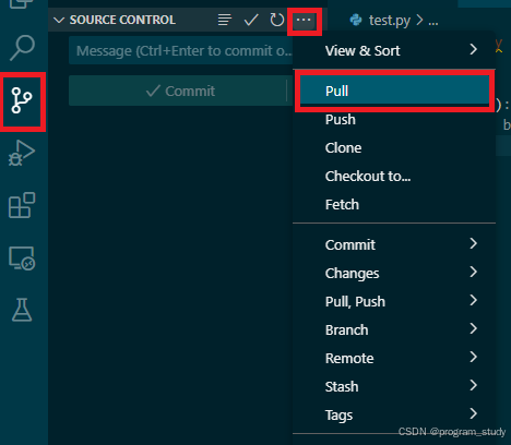 如果需要进行更新,在左侧Source Control中点开然后点击中间的三个点,在菜单中选择Pull,则可以更新相应的文件内容和变更信息。