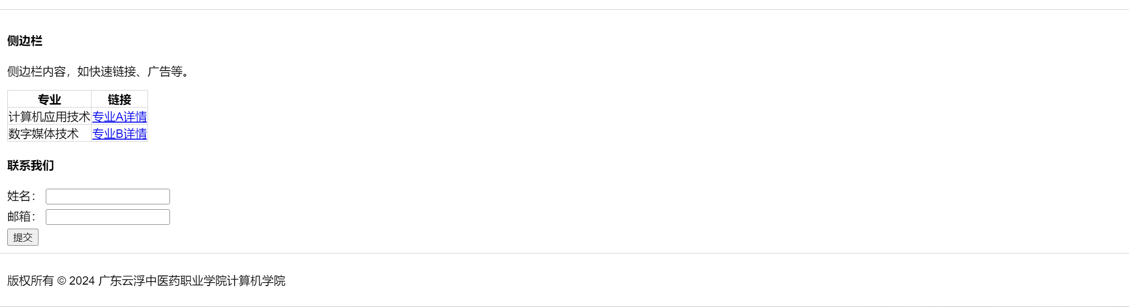HTML 与 CSS 协同打造页面布局。HTML 中,header、nav、main、aside、footer等语义化标签,清晰划分页面不同区域,便于理解和维护。header展示学院名称与欢迎语,nav提供导航菜单,main承载主要内容,aside作为侧边栏,footer显示版权信息。