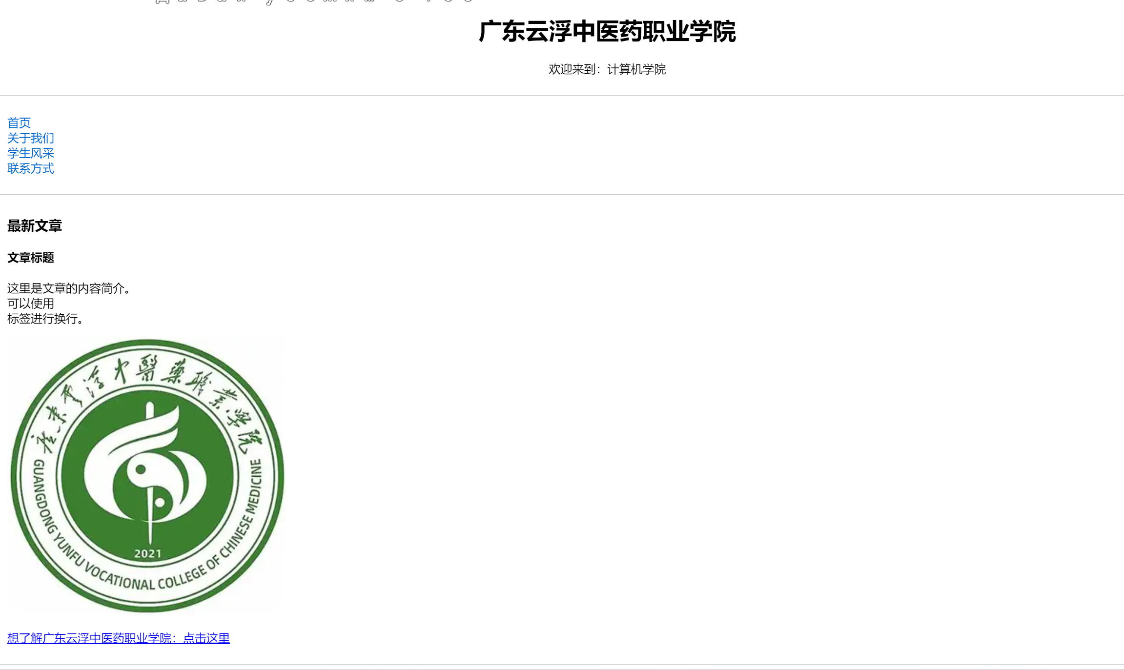 网页用了HTML 与 CSS 协同打造页面布局。HTML 中,header、nav、main、aside、footer等语义化标签,清晰划分页面不同区域,便于理解和维护。header展示学院名称与欢迎语,nav提供导航菜单,main承载主要内容,aside作为侧边栏,footer显示版权信息。