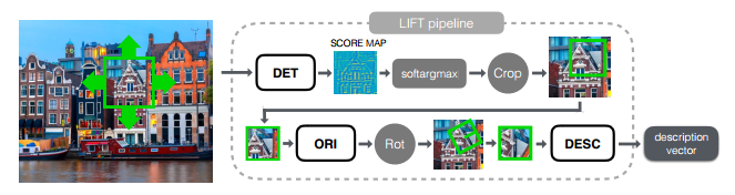 该文介绍了一种深度学习框架,并实现了图像特征点检测、方向估计和描述符提取,其中每一个部分都是基于卷积神经网络CNNs实现,采用了空间转换层来修正图像块得到特征点检测和方向估计。同时,使用argmax function代替传统的非极大值抑制方法,其性能由于其他在这之前已知的方法。总体结构如下: